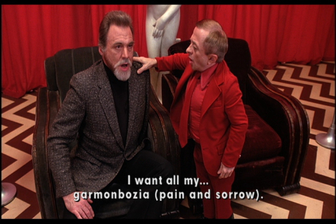(add speaking backwards) ... x (not lying, speaking, thinking openly) speaks with y (lying, talking backwards). x doesn't know that y is lying and can't detect it. y says his lie. x answers. y says his lie. x answers. and so forth and so on indefinitely, while y takes everything that he can get his hands on in order to back up his lie and while y refutes any argument made by x completely, while completely ignoring everything that could lead astray from the wanted effect of the discussion with x, the implemention of y's lie into the head of x. and when x is young and naive and listens and listens and doesn't get it ... well, it may have grave consequences. sorry for just posting a new posting, now i've seen that "edit post"-button. after having written this i came to thinking: it's utterly useless what i wrote about garmonbozia "it's just greed. it's any wish." since garmonbozia conveys everything itself: it's something one wants, that's all what's known. what it is - that is totally unknown - i guess, there must be some strange little man you know from that place back there yes there far off that has told him to get it. it conveys every aspect of "greed" without using that dull, timeworn word. o - what it is - it's creamed corn. is corn a metaphor for the basic thing (of anything), and creamed corn is the superfluous luxury version of it? also: the black lodge, that 2nd part of episode 29. it is not a description of someplace or some kind of consciousness. it actually IS it. those 20 minutes or what, they ARE the black lodge. it is basically incoherence, lack of judgement, lack of second thoughts, lack of orientation. it's depersonalization, every human just being an exchangeable, one and the same, human or ape or what. ((( also coop's coffee, one and the same, turning to scorched engine oil (doesn't it?) - it's that secret vice to indulge in ("shopping", josie poodle cite) - it's that often quoted coop sentence (let you in on a little secret) - the difference between leland's chewing gum and coop's coffee and difference between their outcome is just a natural inclination of leland to interact with people (it's his basic modus operandi), while coop lacks this natural inclination - that's the only thing that saved him and it's nothing one could impute oneself. ))) just images, emotions, instants. and there's an instand belief in language, without the attempt to interpret it. just one sentence and the assumption: what he says is how he thinks. at least within that second of actually uttering something, there can't be a thing faked, a hypocrisy, an acting.