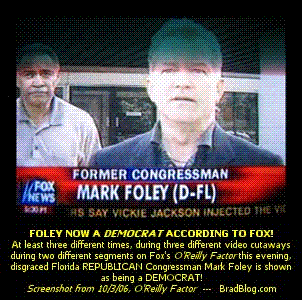 That's hilarious, Danwhy! You know, now that Foley has confessed his molestation by wicked Catholic priest, his disease of alcoholism and the subsequent de riguer re-hab stay all in the same week as his resignation, I'd almost think he could be an honorary Dem. All that remains for him to do now is crash through the wall surrounding the Capitol Building and to appear on Oprah hyping his tell all book. (Oh, Susan that was so unfair and so unlike you!) But I wonder if Fox really did that or if that isn't a photo-shop trick along the lines of this recent attempted maligning of a high-profile Republican . If it's the real thing as BradBlog represents, FOXnews is way SLOPPY. I find all the networks making stupid mistakes on their crawls and captions, however. Susan