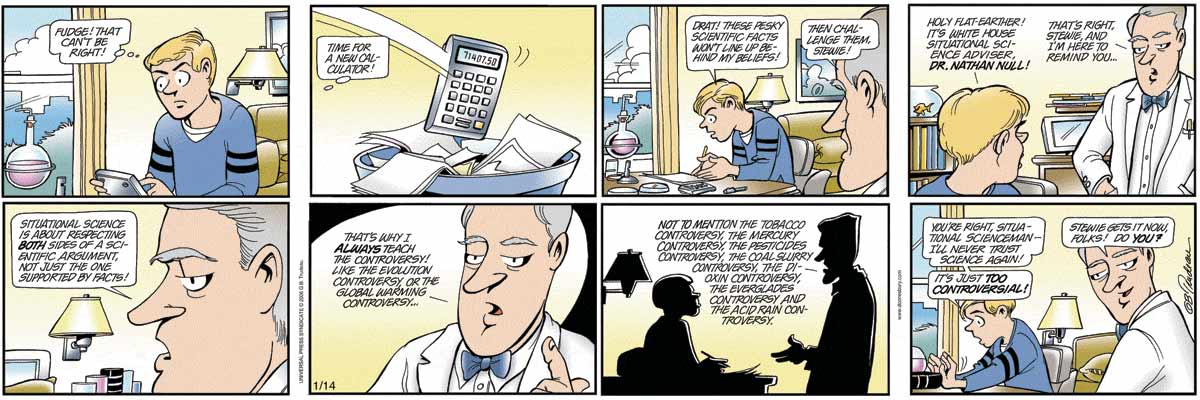 Myself, I don't think science and belief in God need to be at odds with one another. The Doonesbury cartoon, drawn by Bush's Yale classmate btw, is the humorous depiction of the deep-seated fears coursing through the veins of some on the Left, that the Big Bad and Stoopid Fundamentalists on the Right are going to plunge us into the Neo-Dark Ages of an American Theocracy through their ignorance. The article from a "public interest" website is the less amoozing version. Ironically, it has become the (pardon the term) missionary task of these smart people to demonstrate how stoopid and dangerous these pushy fundamentalists really are. Now some of the smart people actually believe in God themselves, but they're not like the stoopid people who are relentlessly pushing us toward the Theocracy. The smart ones, atheists or believers, use their missionary zeal to deal with the most pressing problems of our age... putting the skids to any more horrifying inroads toward the NDA of AT. And so, these wee little stories pop up with as much seriousness behind them as those guys a half century ago running around Times Square with a sandwich boards proclaiming "The End is Near!" I do not believe the American centers of academic science are in any grave jeopardy of being overrun by the likes of the Trudeau (hahaha) cartoon character. Evidence of this fact is that once again, like every year, in 2006, by and large, it was the US scientists who were the winners of international Nobel Science Awards. None of whom have been taken to secret prisons, btw.