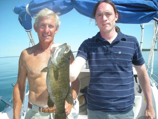 Thanks for the comments, folks! That's funny, Susan, what you said about Scot, because the general opinion in Nahma was that Mike was too close to the log. Upon reviewing the video, Scot was a tad high up there. Now that they are YouTube stars they can review the video and improve their techniques (Mike farther away and Scot lower?) for next year. It was a glorious getaway and Scot and I finally got to go fishing! We've been wanting to, but couldn't get a majority vote the last two years. All day out on the boat Monday, Scot and I kept joking about what a horrible time we were having (although we did get nice sunburns!) and Bill kept saying how Mark and the rest were going to throw up when they saw the size of our catch. We did well, 9 altogether. Scot got the first and then got victimized by gobies the rest of the day. Once I found the hot spot, Bill and I started doing much better.