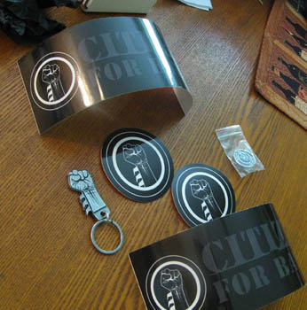 Keychain, bumper stickers, window stickers, and a pin. F*ck yeah. Though it was dampened a bit by my cousin revealing that she'll be attending the premiere in New York City. Damnit.